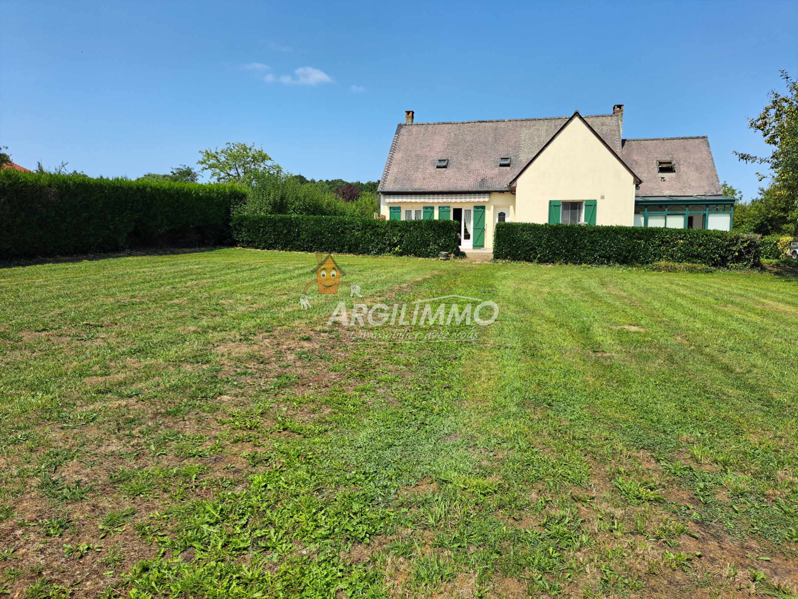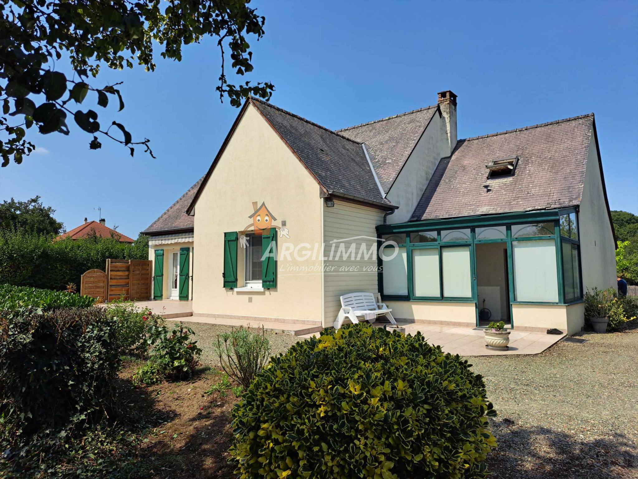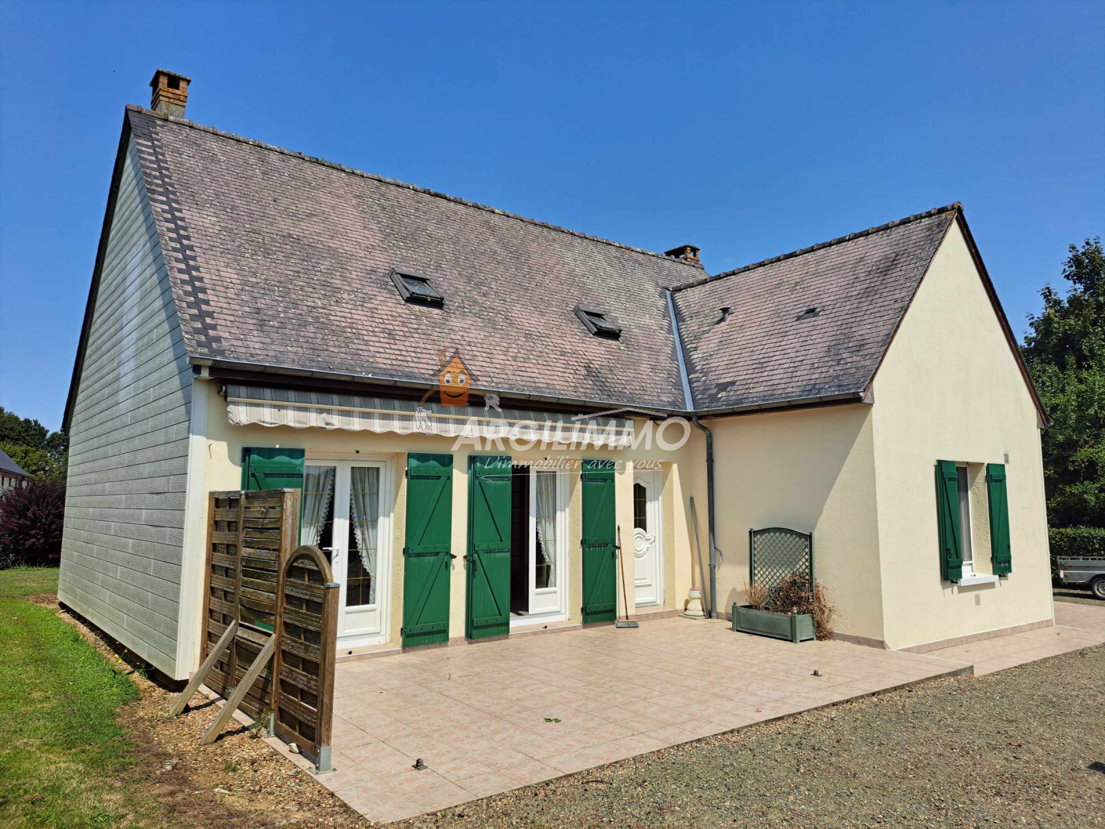 Pavillon indépendant sur environ 2000m² avec terrasse, parking, pelouse et garage + atelier au fond du jardin.