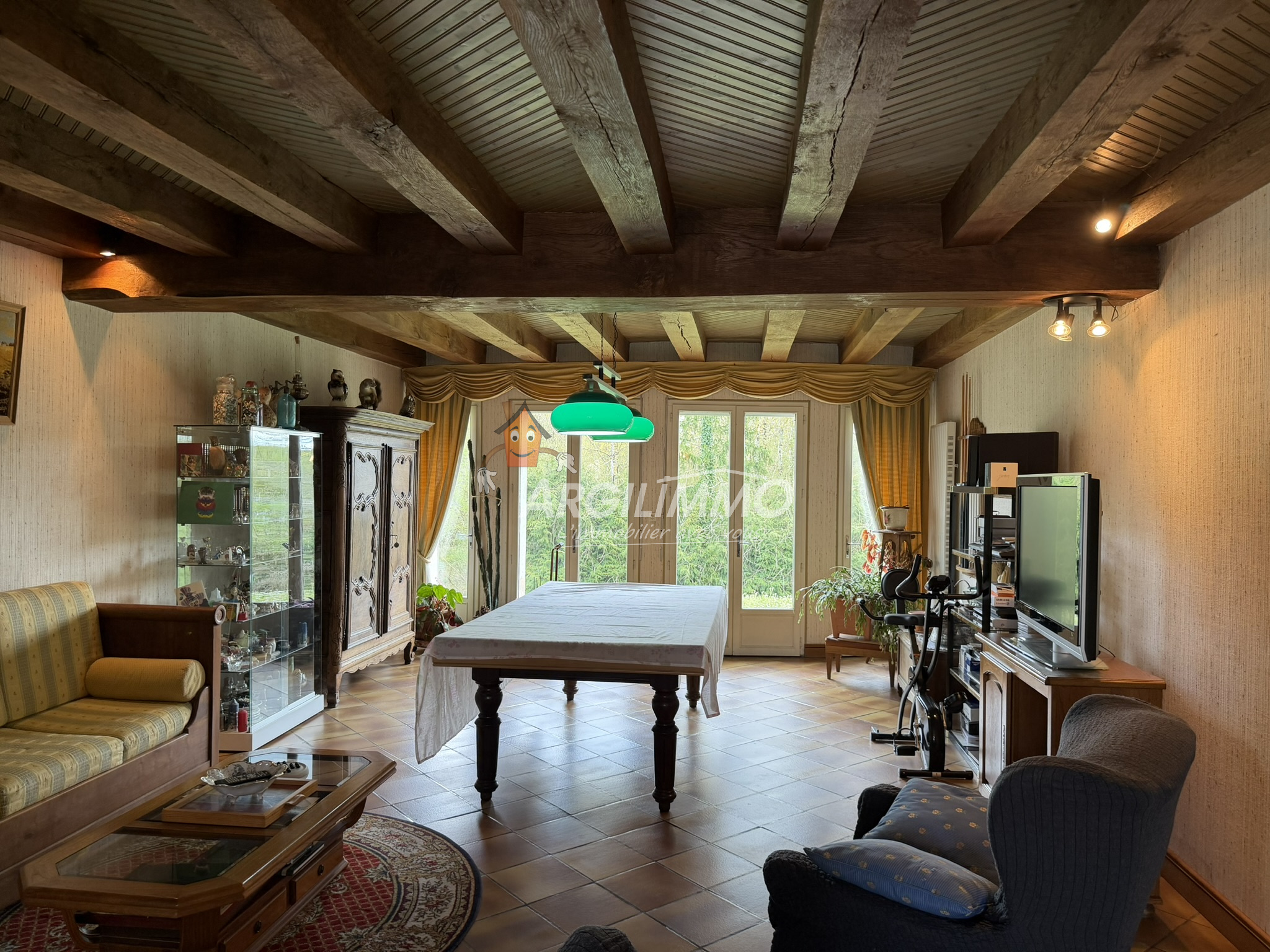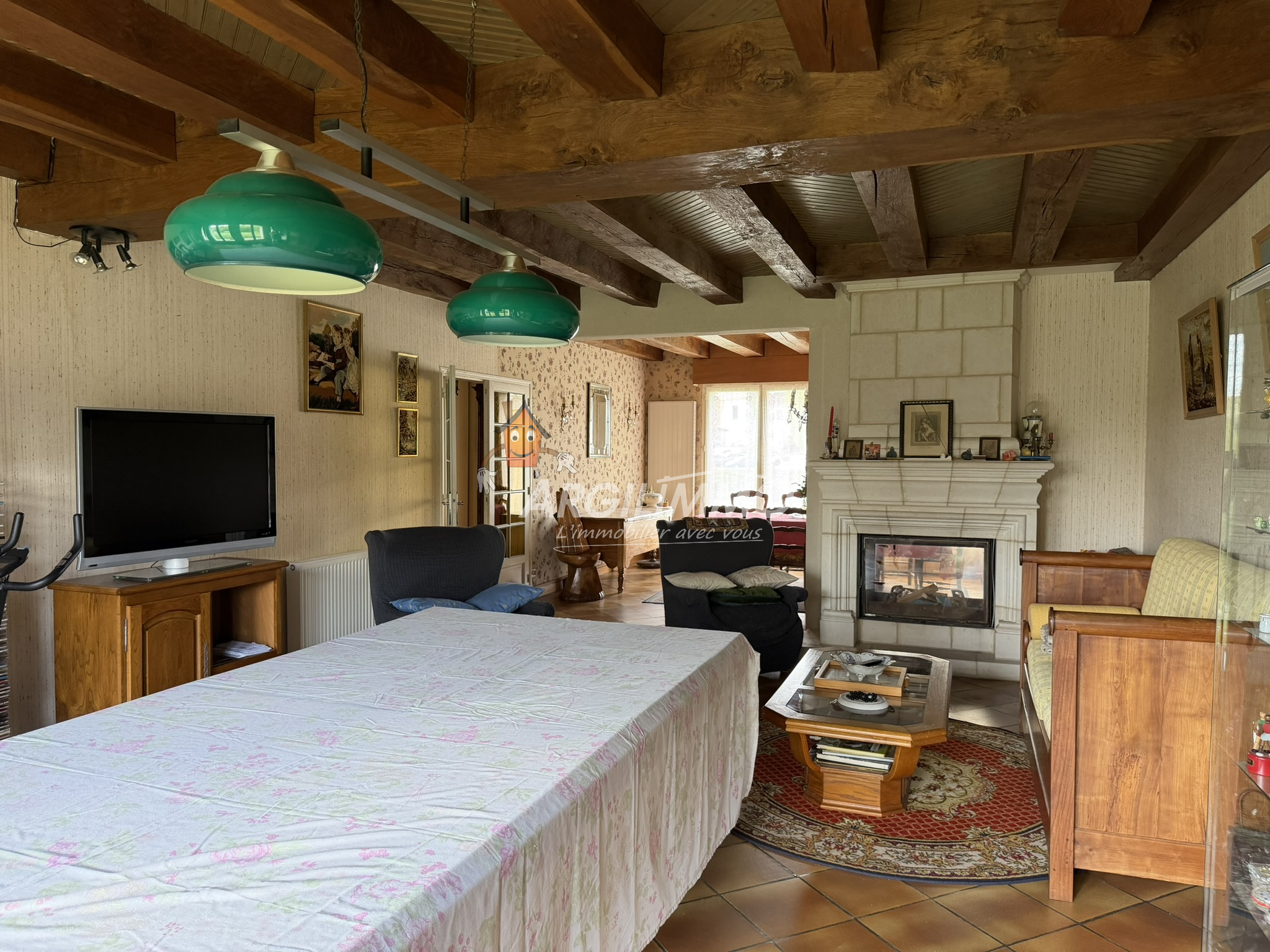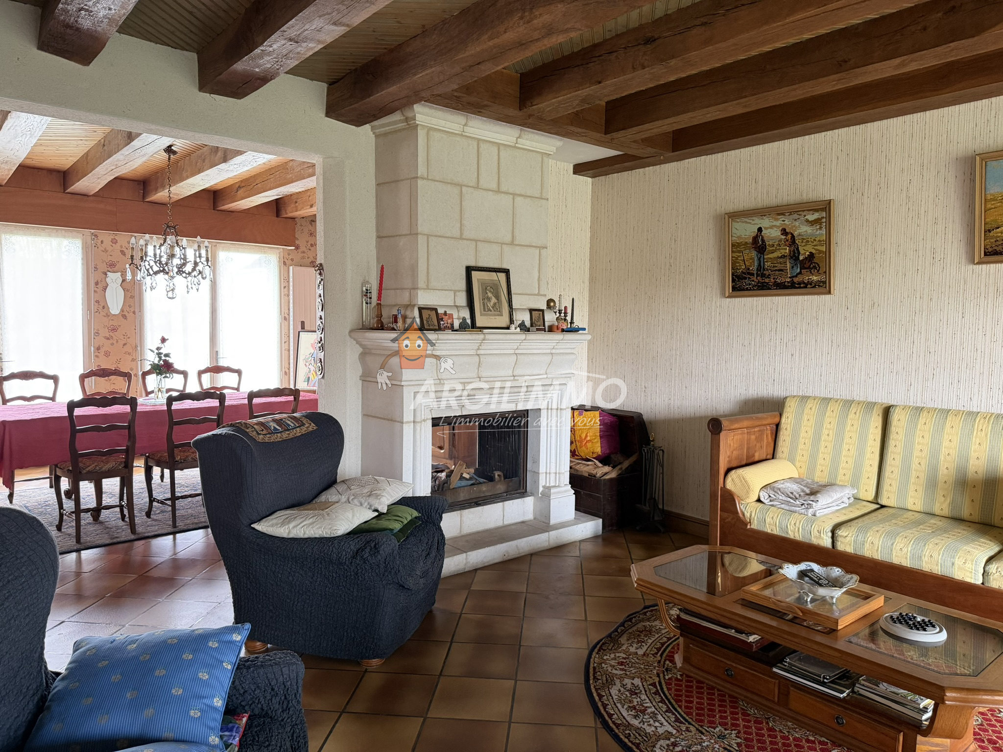 Un grand salon-séjour agrément de sa cheminée double foyer offre un espace chaleureux et convivial pour vos moments de détente.